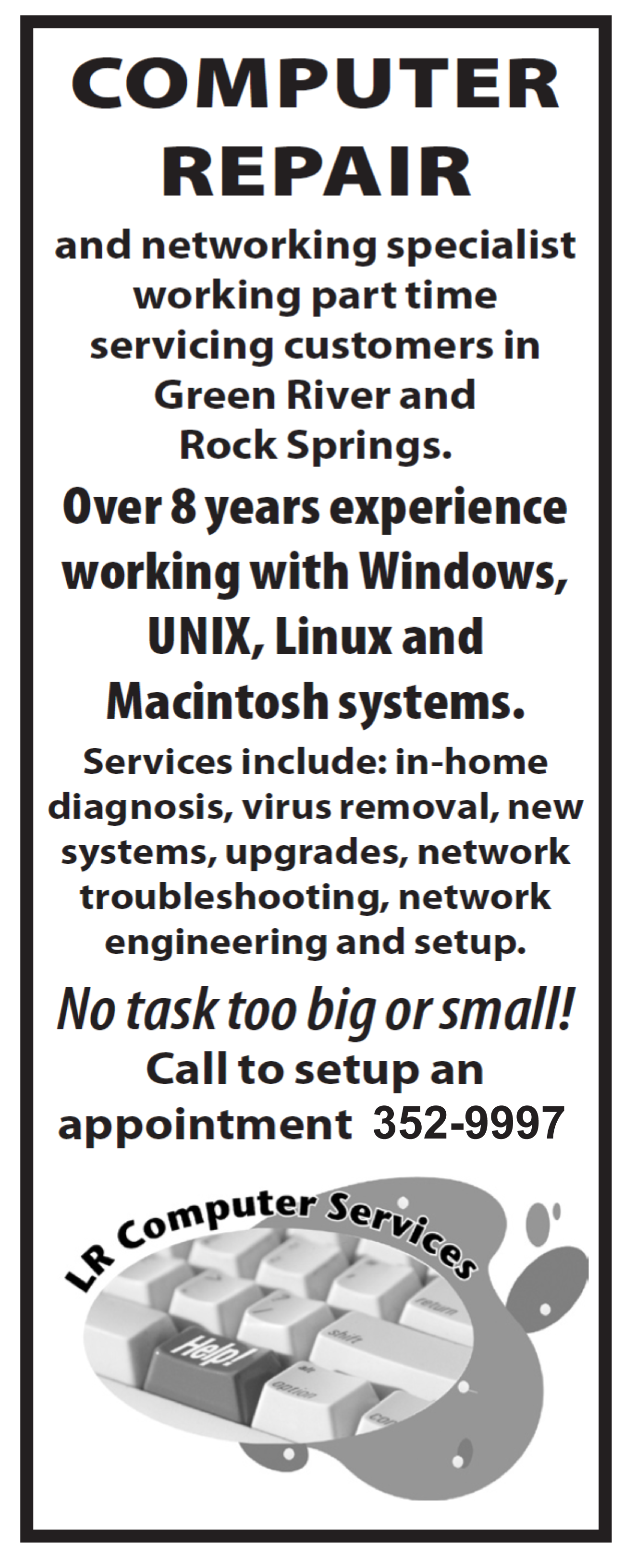 We strive to keep improving the services we provide. That’s the reason we started business: to provide essential technical services to our customers. At the beginning we worked with websites, e-mails, and game servers. We slowly evolved into business computer systems and networks. Over the course of our history, LR's portfolio of services has grown as both the industry and customer needs new innovations. The two things we haven’t innovated? Our prices and our local Wyoming owner: both the same since the start.